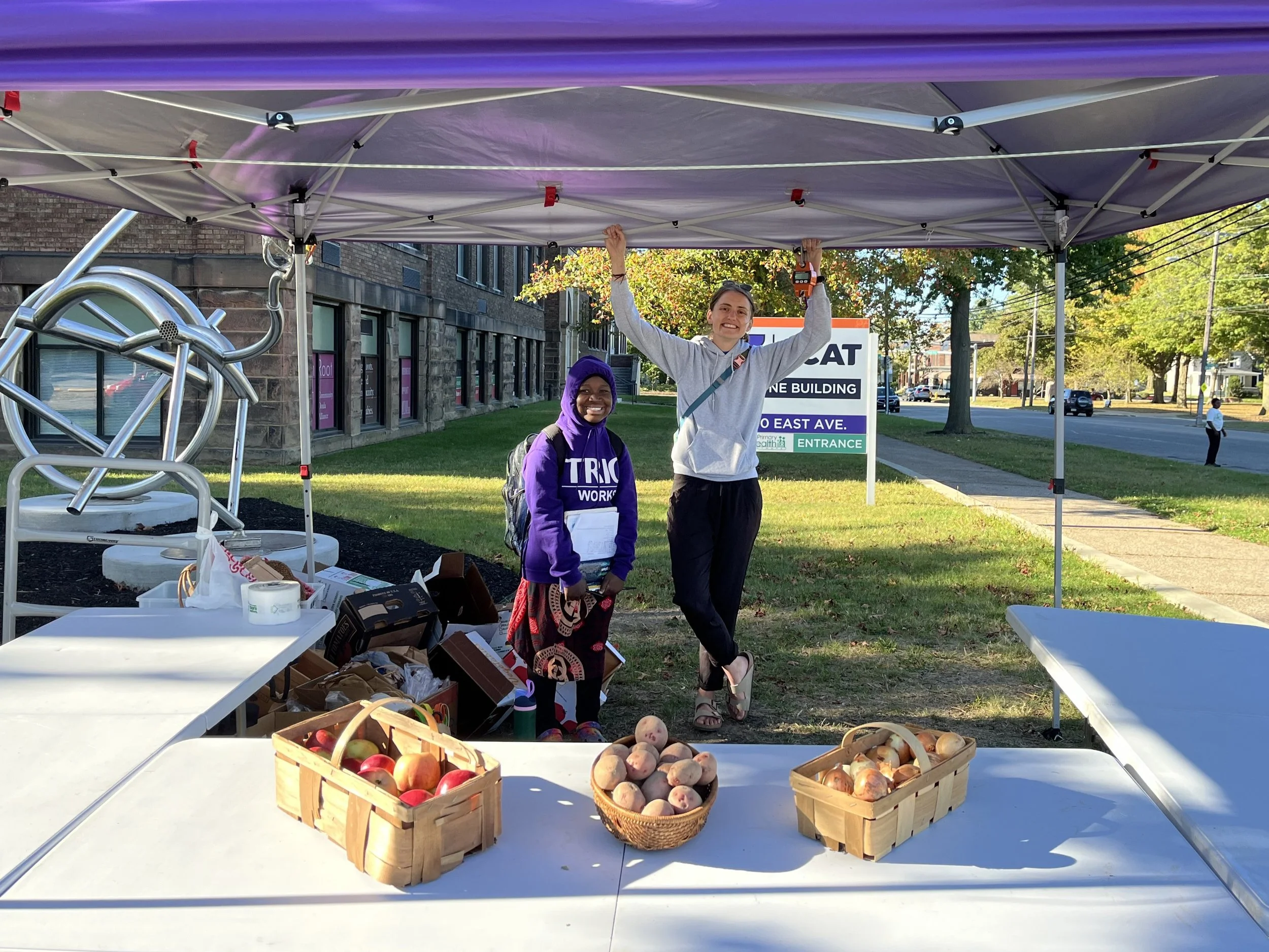 October 1st was the last market on East Ave this season. The spirit of the market was high and so were the winds! Our staple purple tent, although staked into the ground, took flight when a big gust blew by. Groundwork Erie Executive Director, Erin Carey, and one of our regular market-goers worked together to jerry-rig a solution. It was beautiful to see the two collaborate, even with neither speaking the other person’s language, to tie one corner of the tent to our tables and bungee cord the other corner to ECAT’s metal sculpture behind. Even with those repairs, our market staff had to be very mindful to hold our tent in place (as you see Erin doing in the picture above) when big winds rolled through.