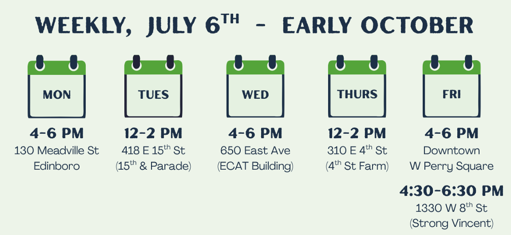 In addition to Groundwork Erie’s two market stands, four other PWYC markets take place around our city each week. PWYC season will continue throughout the summer months into the beginning of October. We hope to see you stop by a market and get some fresh, locally grown produce!